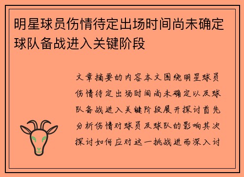 文章摘要的内容:本文围绕明星球员伤情待定、出场时间尚未确定,以及球队备战进入关键阶段展开探讨。首先分析伤情对球员及球队的影响,其次探讨如何应对这一挑战,进而深入讨论球队战术调整和心态调适。最后,总结对...