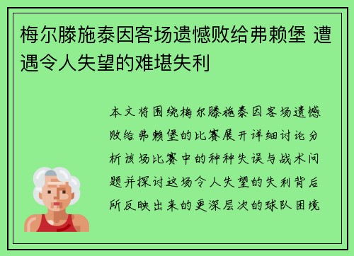 本文将围绕梅尔滕施泰因客场遗憾败给弗赖堡的比赛展开详细讨论,分析该场比赛中的种种失误与战术问题,并探讨这场令人失望的失利背后所反映出来的更深层次的球队困境。从比赛的整体表现、战术执行上的问题、关键球员...