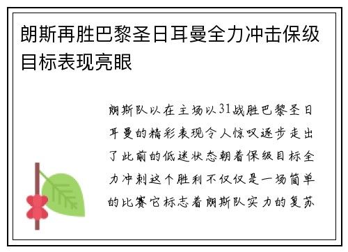 朗斯队以在主场以3-1战胜巴黎圣日耳曼的精彩表现,令人惊叹,逐步走出了此前的低迷状态,朝着保级目标全力冲刺。这个胜利不仅仅是一场简单的比赛,它标志着朗斯队实力的复苏,也预示着他们在法甲保级的希望正在变...
