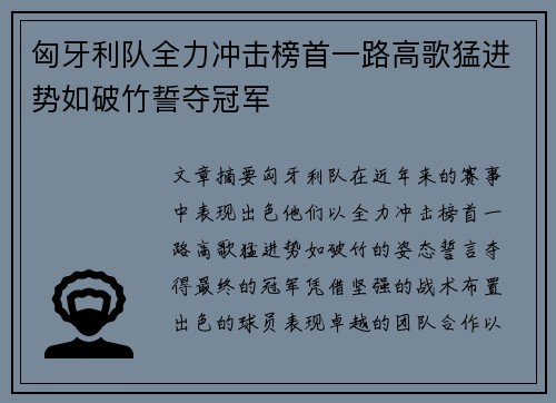 文章摘要:匈牙利队在近年来的赛事中表现出色,他们以全力冲击榜首、一路高歌猛进、势如破竹的姿态,誓言夺得最终的冠军。凭借坚强的战术布置、出色的球员表现、卓越的团队合作以及卓越的教练指导,匈牙利队正以强劲...